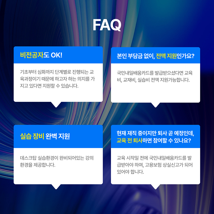지점을 선택하세요 강남 강남AI 종로 신촌 구로 천호 노원 안양 안산 성남 구리 일산 김포 동탄 남양주 강릉 교육과정을 선택하세요 웹디자인·웹퍼블리셔 편집디자인·영상편집 전산세무회계·ERP IT·프로그래밍 컴퓨터활용·OA 건축·기계설계 자격증과정 국가기간전략산업훈련 영상(프리미어&애펙)을 활용한 웹&앱 UI/UX디자인 피그마(Figma)를 활용한 웹&앱 UI/UX디자인 피그마(Figma)와 노션(Notion)을 활용한 웹&앱 UI/UX디자인 실업자 쇼핑몰, 오픈마켓 상세페이지 제작+GTQ(일러스트,포토샵) 재직자 UI/UX디자인 피그마(Figma) 프로젝트 [학원자체시험]일러스트자격증(GTQi1급/2급) [학원자체시험]포토샵자격증(GTQ1급/2급) 반응형웹사이트제작(HTML5+CSS3) 웹디자인기능사(HTML5, CSS3, Javascript, jQuery) 실기 일러스트를 활용한 광고 콘텐츠 제작 자바스크립트(프런트엔드, 백엔드)웹프로그래밍 포토샵을 활용한 광고 콘텐츠 제작 교육과정선택(5개과정만 문의가능) 지점을 선택해주세요 내용을 작성해주세요 이 름 휴대폰 번호 이메일 주소 문의하실 내용 개인정보수집 및 이용에 대한 동의 [개인정보의 수집 및 이용목적] "개인정보"라 함은 생존하는 개인에 관한 정보로서, 당해 정보에 포함되어 있는 성명, EMail 등의 사항에 의하여 당해 개인을 식별할 수 있는 정보(당해 정보만으로는 특정 개인을 식별할 수 없더라도 다른 정보와 용이하게 결합하여 식별할 수 있는 것을 포함)를 말합니다. 회사는 서비스(게임, 홈피, 아바타, 쇼핑몰) 등을 통하여 이용자들에게 맞춤식 서비스를 비롯한, 보다 더 향상된 양질의 서비스를 제공하기 위하여 이용자 개인의 정보를 수집하고 있습니다. 회사는 이용자의 사전 동의 없이는 이용자의 개인정보를 함부로 공개하지 않으며, 수집된 정보는 아래와 같이 이용하고 있습니다. 첫째 이용자들이 제공한 개인정보를 바탕으로 보다 더 유용한 서비스를 개발할 수 있습니다. 회사는 신규 서비스개발이나 컨텐츠의 확충 시에 기존 이용자들이 회사에 제공한 개인정보를 바탕으로 개발해야 할 서비스의 우선 순위를 보다 더 효율적으로 정하고, 이용자들이 필요로 하는 컨텐츠를 합리적으로 선택하여 제공할 수 있습니다. 둘째 이용자들이 등록하신 개인정보는 서비스와 관련된 뉴스, 이벤트, 업데이트 등의 소식을 받아보실 수 있도록 이용자님의 동의를 구하고 발송하는 뉴스레터 등 서비스를 보다 원활하게 제공하기 위한 목적으로 사용됩니다. 셋째 회사는 게임 및 각종 무료 서비스를 제공하기 위해서 광고를 게재하고 있는데, 이용자들에 대한 정확한 개인정보를 바탕으로 각 서비스나 메뉴 등에 적절하게 광고와 내용들을 전달해 드릴 수 있으며, 이것은 궁극적으로 이용자 여러분들께 드리는 또 하나의 정보로서의 가치를 지니게 됩니다. 회사는 광고주들로부터 광고를 받아 광고주들이 대상으로 하려는 이용자의 유형에 맞게 광고를 보여줄 뿐, 광고주들에게는 절대로 이용자들의 개인정보를 보여주거나 공하지 않습니다. 넷째 이용자의 인터넷 쇼핑 서비스, 커뮤니케이션 서비스를 위한 목적으로 사용됩니다. [수집하는 개인 정보 항목 및 수집 방법] 회사에서는 이용자들이 회원제 서비스를 이용하기 위해 회원으로 가입하실 때 서비스 제공을 위한 필수적인 정보를 온라인상에서 입력 받고 있습니다. 회원 가입 시 받는 필수 정보는 이름, 생년월일, 전화번호(또는 핸드폰번호 중 택일), 전자우편 주소입니다. 또한 회사가 주관하는 경매, 설문조사나 이벤트 행사 시 통계분석이나 경품제공 등을 위해 선별적으로 개인정보 입력을 요청할 수 있고, 회사가 발송하는 광고 메일 수신과 함께 이벤트, 경품 등의 혜택을 받는 광고 메일 수신자가 되는 경우에도 선별적으로 개인정보 입력을 요청 받을 수 있습니다. 그러나 이러한 경우에도 이용자의 기본적 인권침해의 우려가 있는 민감한 개인정보 (인종, 사상 및 신조, 출신지 및 본적지, 정치적 성향 및 범죄기록, 성생활 등)는 가급적 수집하지 않으며 부득이하게 수집하는 경우 이용자들의 사전 동의를 반드시 구할 것입니다. 회사는 입력하신 정보를 이용자들에게 사전에 밝힌 목적 이외에 다른 목적으로는 사용하지 않으며 외부로 유출하지 않습니다. 단, 서비스 페이지에 링크되어 있는 웹사이트들이 개인정보를 수집하는 행위에 대해서는 회사의 '개인정보취급방침'이 적용되지 않음을 알려드립니다. [수집하는 개인정보의 보유 및 이용기간, 개인정보의 파기절차 및 방법] 회원의 동의 하에 수집된 개인정보는 회원 자격이 유지되는 동안 보유 및 이용되며, 해지를 요청한 경우에는 재생할 수 없는 방법에 의하여 디스크에서 완전히 삭제하며 추후 열람이나 이용이 불가능한 상태로 처리됩니다. 단, 회사는 개인정보 도용 등으로 인한 피해 발생시 복구와 피해자 보호 등을 위해 회원의 ID, 성명, 전자우편 주소는 해지한 날로부터 최대 3개월 동안은 임시로 보관할 수 있으며 이후에는 재생할 수 없는 방법으로 완전히 삭제합니다. 또한 아래의 각호에 해당되는 경우는 예외로 합니다. [개인정보를 제3자에게 공유 및 제공하는 경우] 회사는 이용자의 사