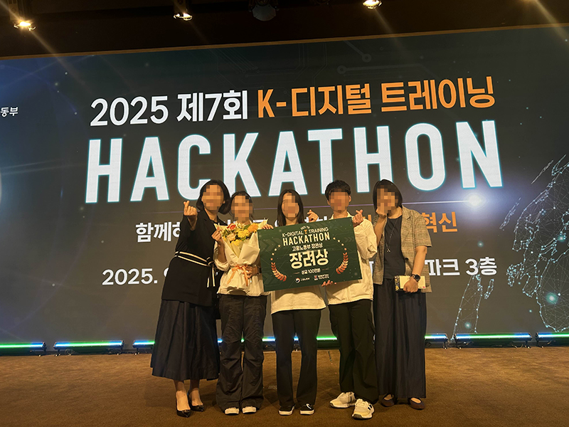 제7회 K-디지털 트레이닝 해커톤 대회 '장려상' 수상! 2025.10.15 안녕하세요. 고용노동부와 한국직업능력심사평가원(KSQA)이 주최한제 7회 해커톤 대회에서 '[삼정] ESG 데이터 기반 재무영향 자동화 개발자 과정 2기'훈련생(구ㅇ승, 이ㅇ희, 이ㅇ)들이 장려상을 수상하였습니다.수상을 진심으로 축하드리며,이들의 열정과 도전이 더 많은 훈련생분들에게 긍정적인 영향을 미치길 바랍니다.감사합니다.
